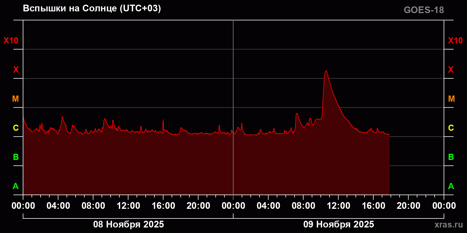 Вспышка произошла всё в той же «легендарной» области 4274. Максимум излучения зарегистрирован в 10:35 по московскому времени (https://xras.ru/image/xray_RAL5_20251109.png). Балл в каталогах — X1.79.