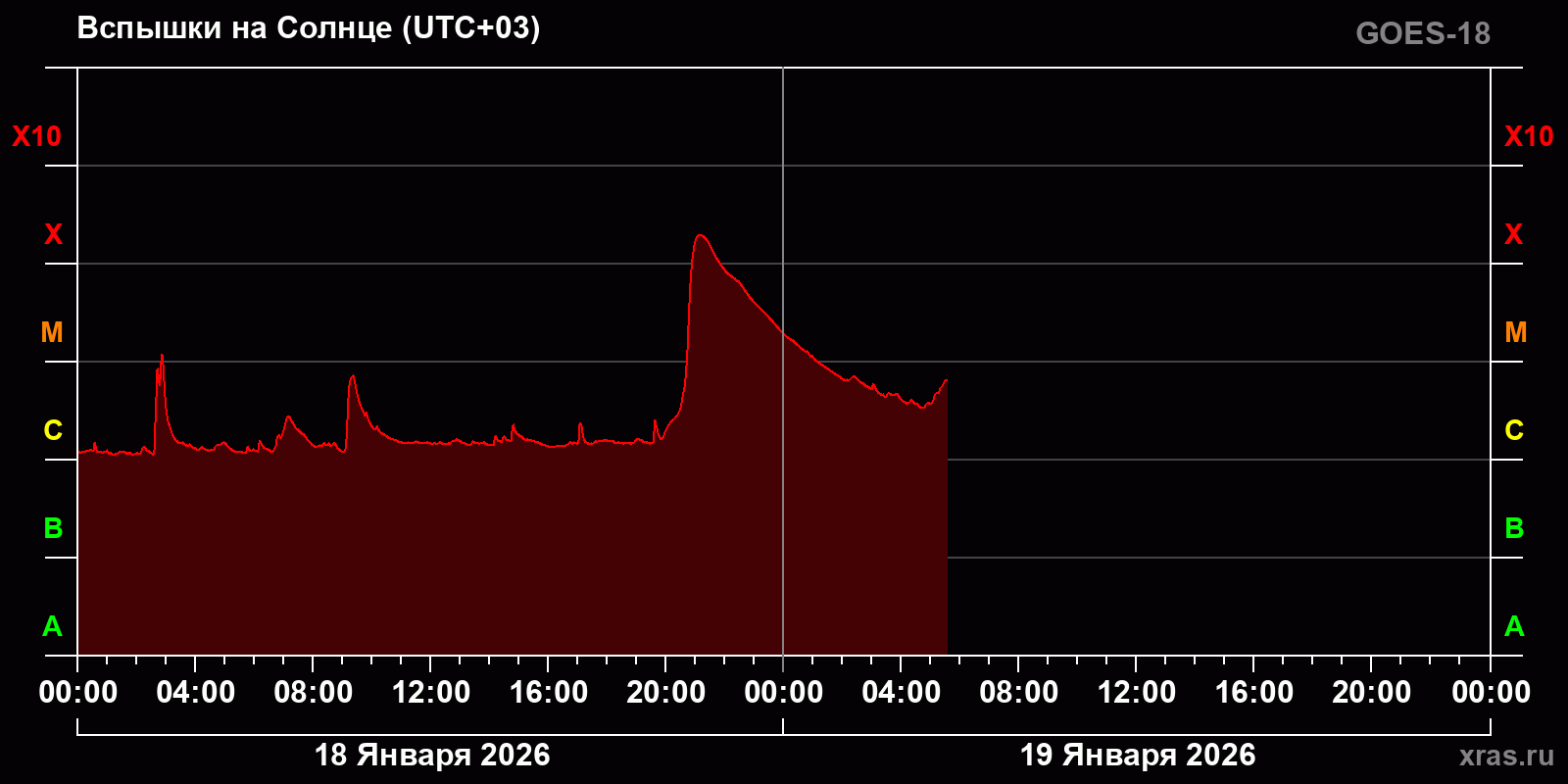 Вспышка — в области 4341 — в центре видимого солнечного диска напротив Земли (https://xras.ru/info/images/20260118_173000_hmiigr.jpg). Крупные взрывы в начале года на обратной стороне Солнца (https://t.me/lpixras/1993) были здесь же.