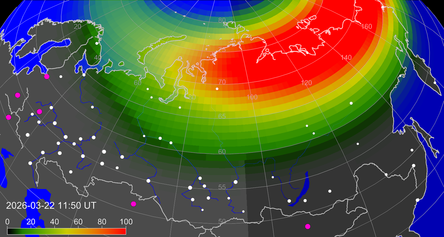 Событие классифицируется как 10 по 10-балльной шкале. К сожалению, всплеск начался с запаздыванием на половину суток по сравнению со вчерашним прогнозом и его ожиданиями в ночь с 21 на 22. В результате на большей части страны сейчас день. Никаких гарантий, что авроральный овал не распадется до ночи, нет — более того, вероятность, что распадется, гораздо выше. Но можно поглядывать на графики (https://xras.ru/aurora.html).